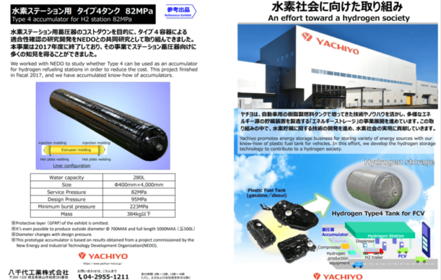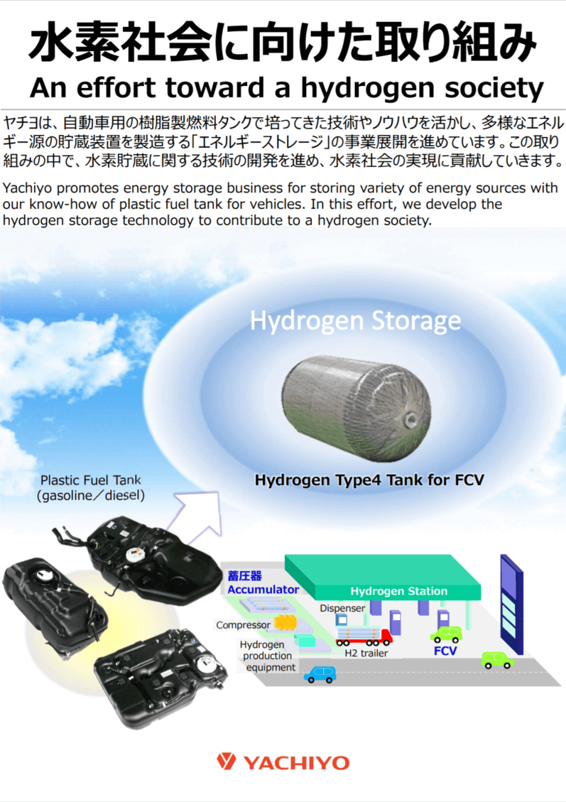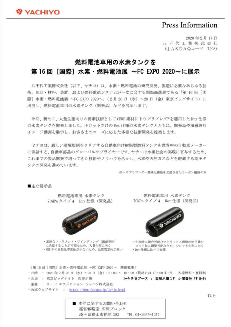 Yachiyo is participating in the 16th [International] Hydrogen and Fuel Cell Exhibition FC EXPO 2020, an international business exhibition that brings together all the technologies, parts and materials, equipment, and fuel cell systems necessary for research and development and manufacturing of hydrogen and fuel cells. We will be displaying hydrogen tanks (developed products) for fuel cell vehicles, etc., at Tokyo Big Sight from February 26 to February 28. This time, we have newly developed a dry specification hydrogen tank that uses Tow-prepreg* in addition to CFRP material as an elemental technology for mass production. In addition to hydrogen tanks with wet specifications for small lots, we will exhibit developed products and layered design image videos, and propose a variety of technological developments tailored to customer needs.