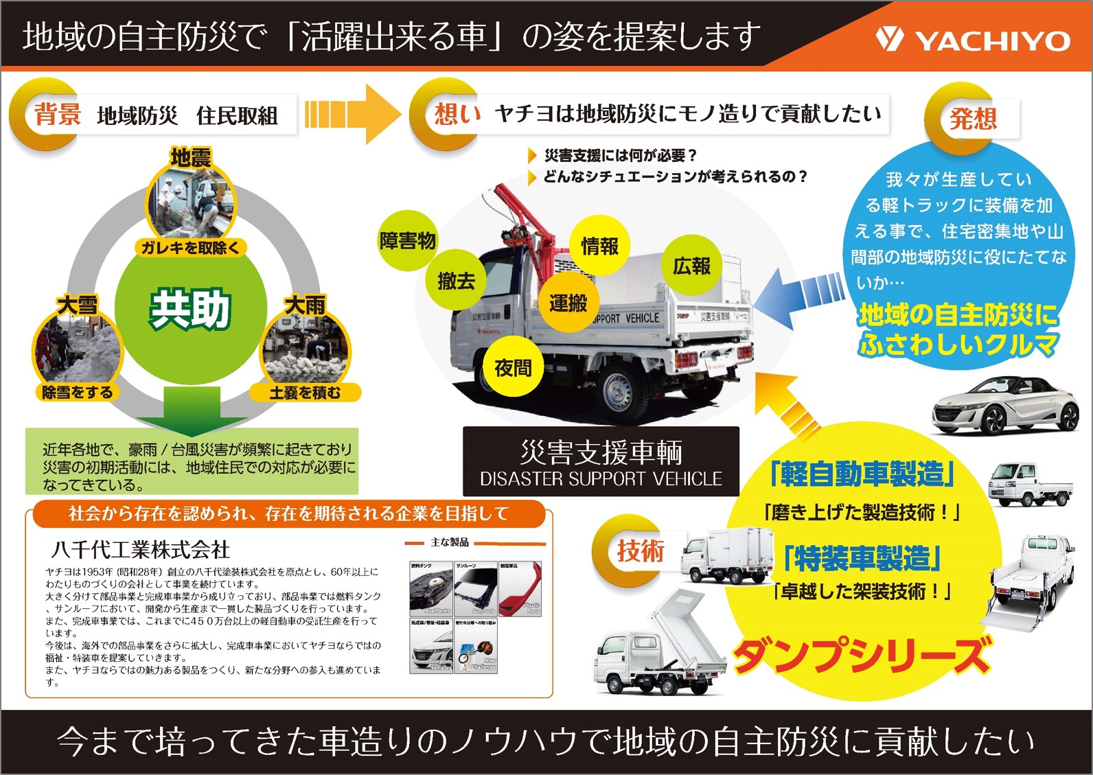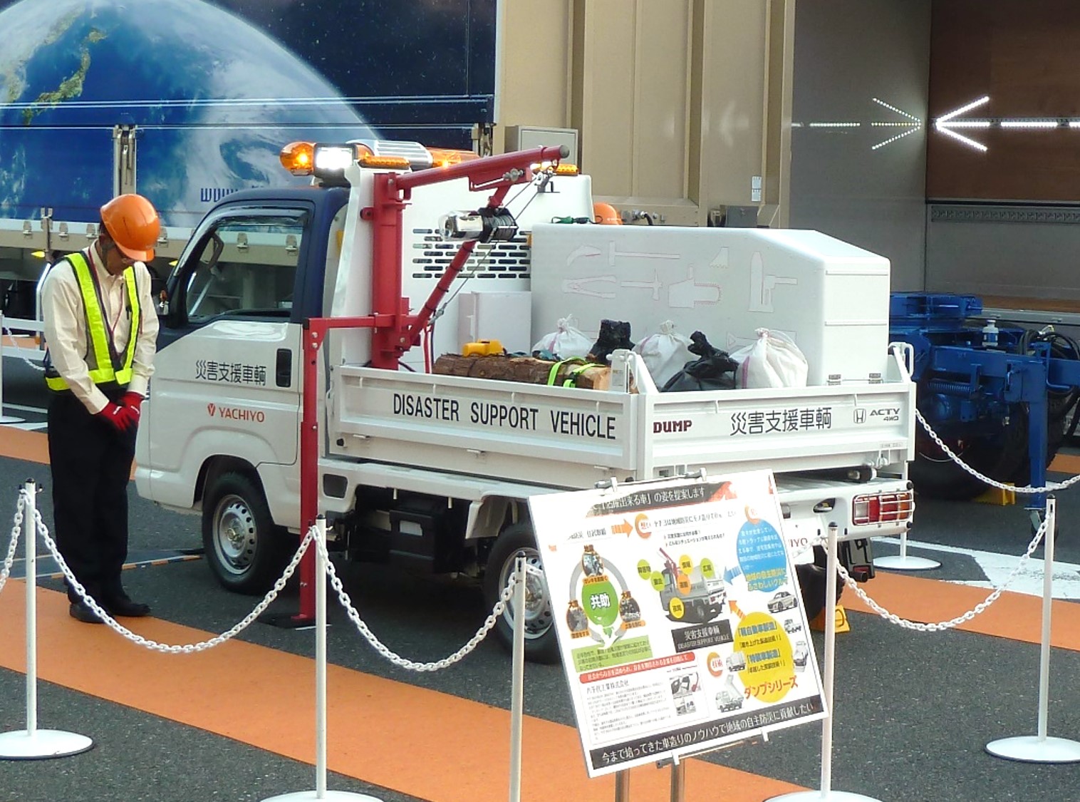 Additionally, at a joint exhibition held by the Japan Aut-Body Industries Association Inc., of which Yachiyo is a member, we exhibited a disaster initial support vehicle based on the Honda Acty special purpose vehicle series dump truck.
