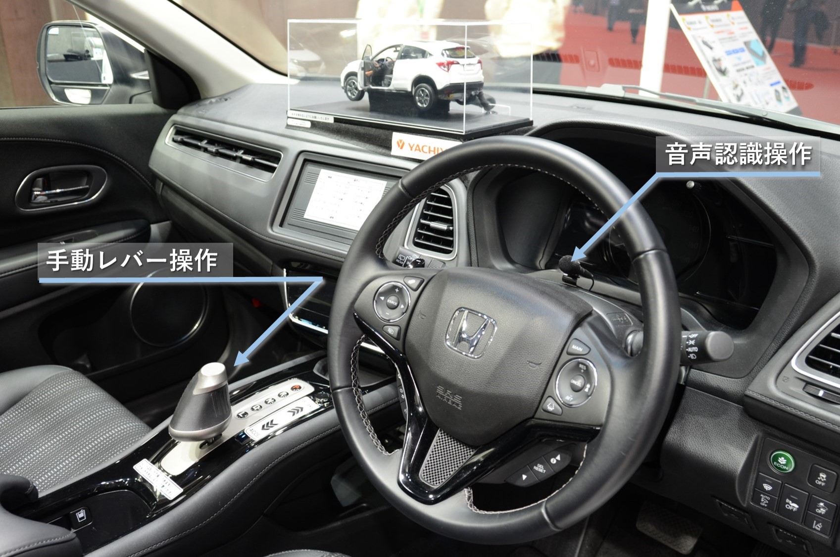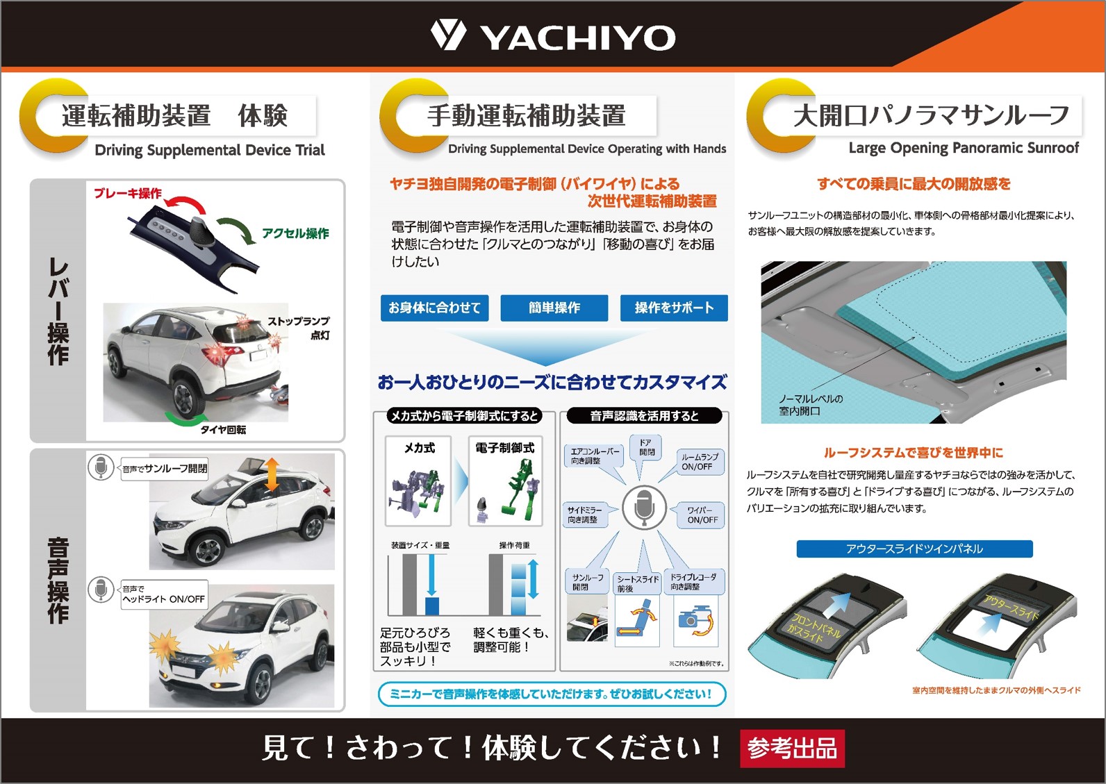 Most driving assistance devices that allow people with disabilities to drive are mechanically operated, but Yachiyo is developing driving assistance devices that use electronic control (by-wire). We aim to secure interior space by downsizing the equipment and arbitrarily change of the operation weight. At the exhibition, we installed a manual driving assistance device on the Honda Vezel, and introduced a mechanism that allows the miniature car to respond by rotating the wheels by operating a manual lever, or turning on the headlights by voice recognition.