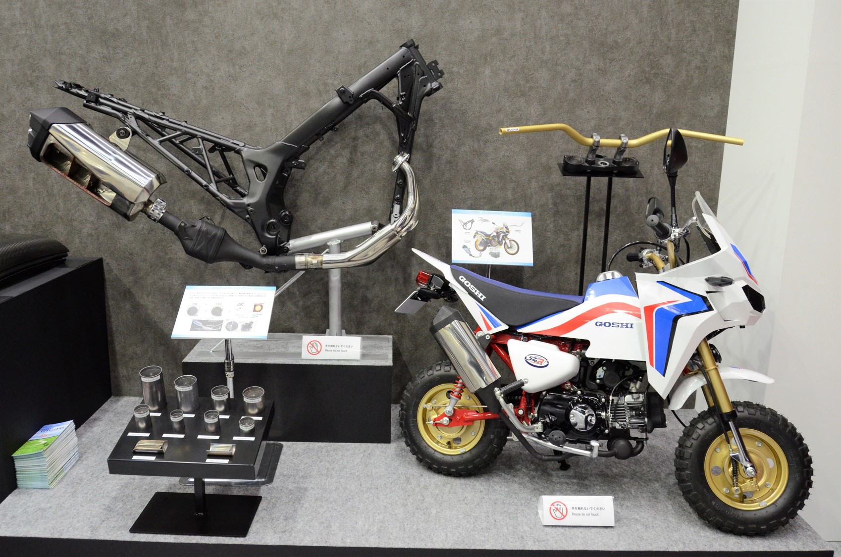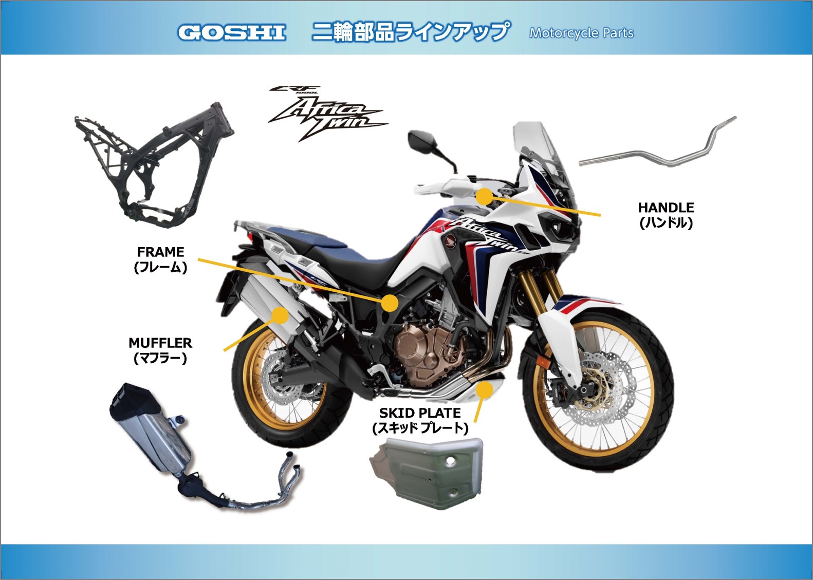 Among the motorcycle parts produced by Goshi Giken Kogyo, Yachiyo's consolidated subsidiary, metal catalytic converters, the main product, as well as aluminum frames, steering handles, mufflers, etc., for Honda CRF1000L Africa Twin, are exhibited.