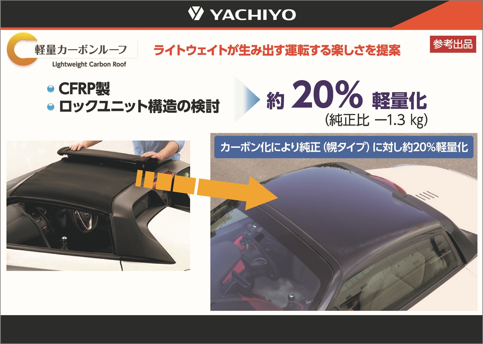 The CFRP (Carbon Fiber Reinforced Plastic) technology cultivated through the track and field wheelchairs manufactured and sold by Yachiyo has been applied to the roof of the car. We installed a carbon roof on the Honda S660, which greatly contributes to lowering the center of gravity and reducing weight.